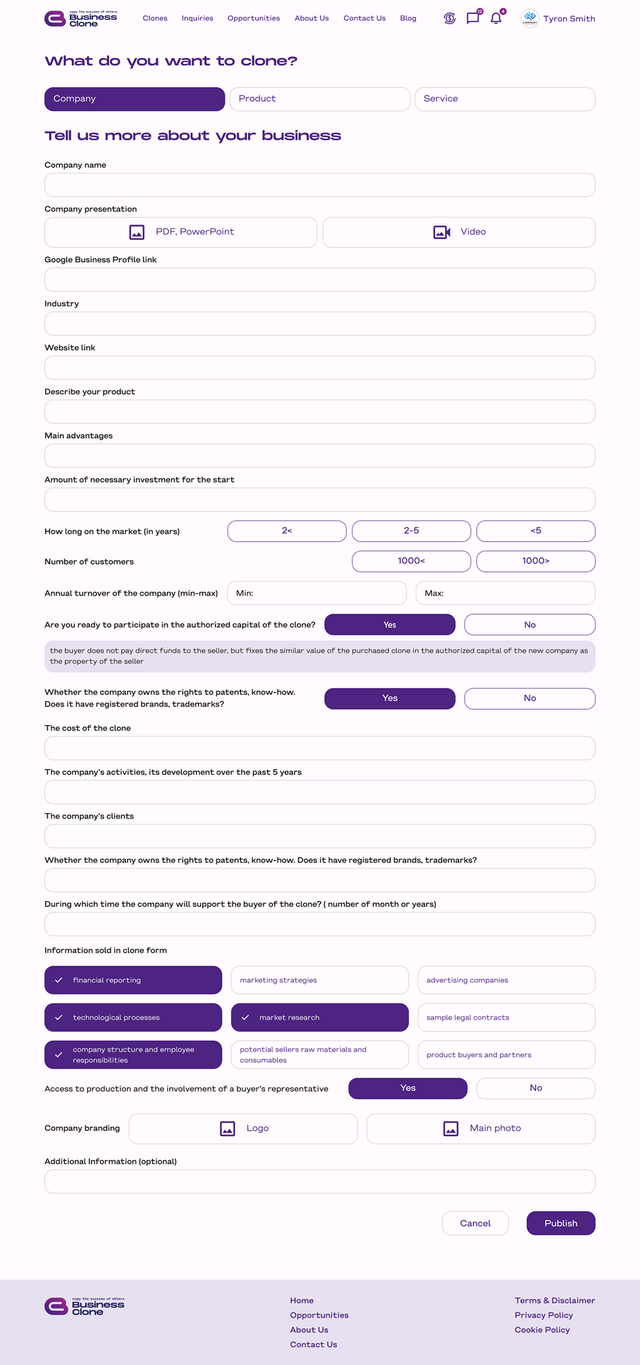 Так виглядає сторінка для огліду інформації про “клон”, і форма, де підприємець описує свій бізнес аби опублікувати на сайті.