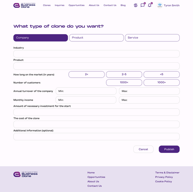 BusinessClone — це інноваційна платформа, яка допомагає підприємцям і інвесторам запускати або масштабувати бізнеси, копіюючи перевірені бізнес-моделі. Основна ідея полягає у «клонуванні» успішних компаній та їх адаптації під нові ринки. Це створює унікальну можливість для підприємців отримувати додатковий дохід, а для інвесторів — швидко стартувати з мінімальними ризиками.